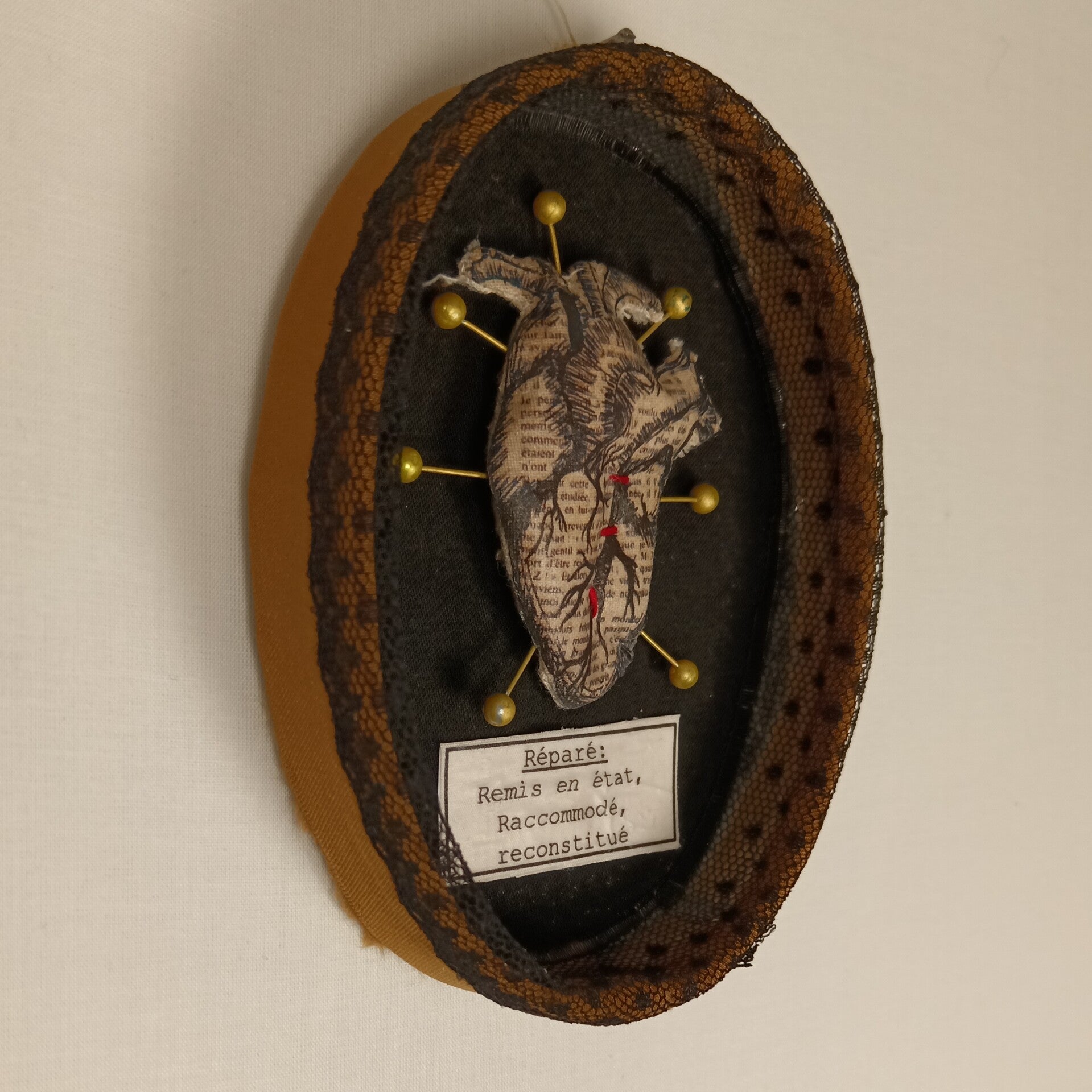 Ecrin boite en carton, fond tissu noir, épingles dorées et dentelle noire, bordé d'un tissu ocre satiné .