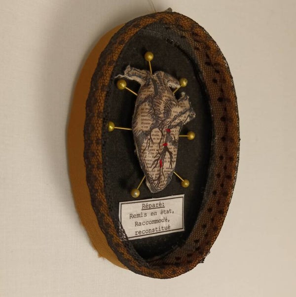 Dessin Coeur Mar Plij tranféré sur textile et mis en volume, cousu de fil rouge.