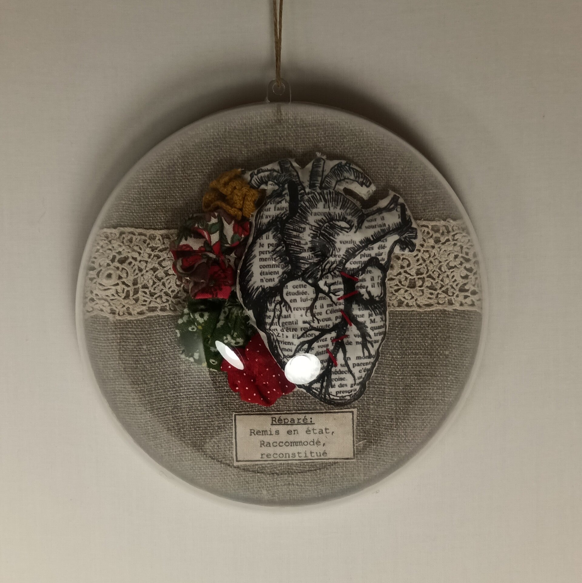 Dessin Coeur Mar Plij tranféré sur textile et mis en volume, cousu de fil rouge.