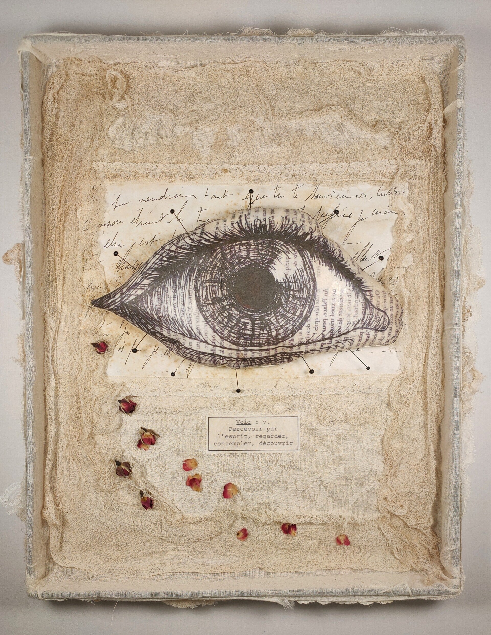 Ecrin boite en carton, fond poème manuscrit sur vieux papier, vieille dentelle, tissu ancien, pétales de roses séchées.