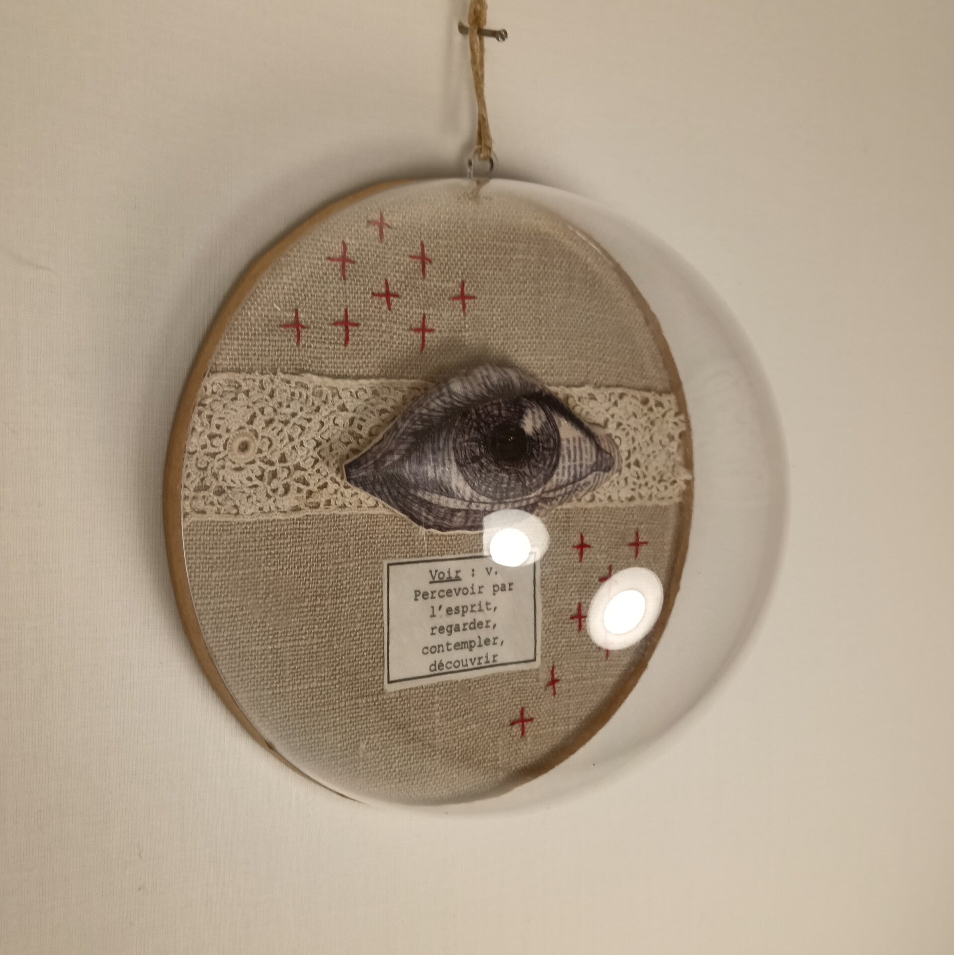 Dessin Oeil Mar Plij tranféré sur textile et mis en volume,