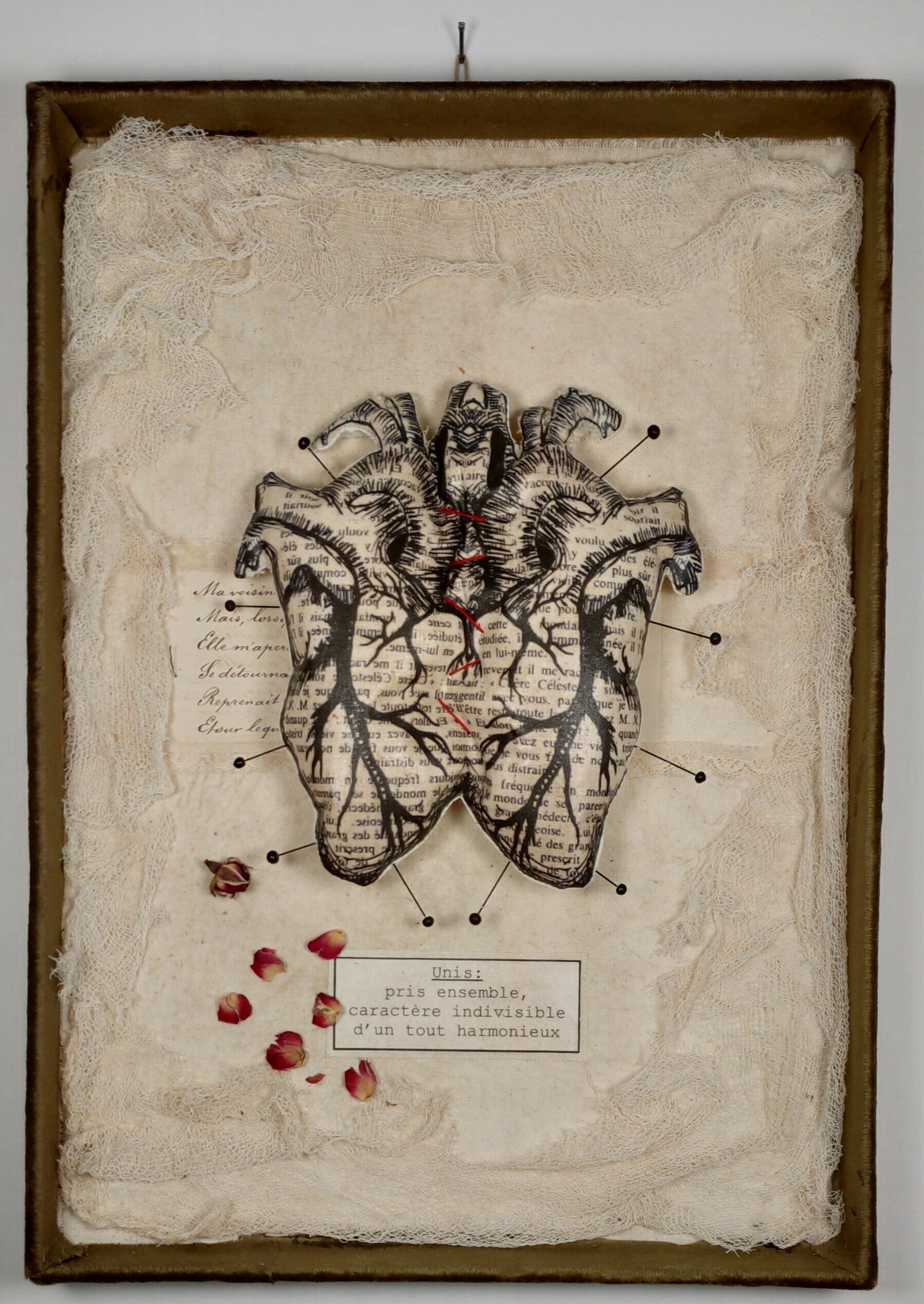 Ecrin boite en carton, fond poème manuscrit sur vieux papier, vieille dentelle, tissu ancien, pétales de roses séchées, cadre tissu velours olive.