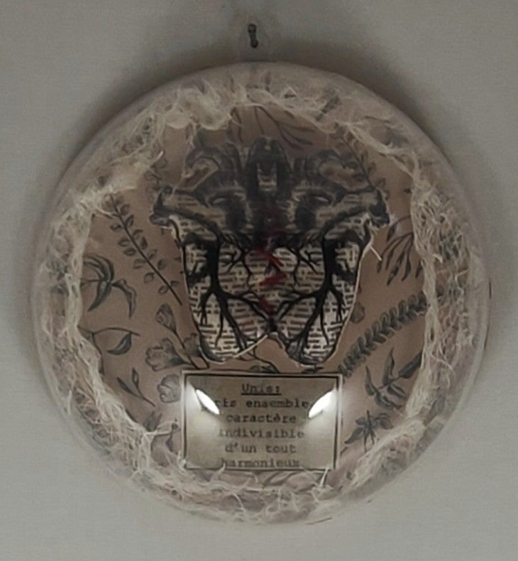 Dessin double coeur Mar Plij, cousu de fils rouge, tranféré sur textile et mis en volume.