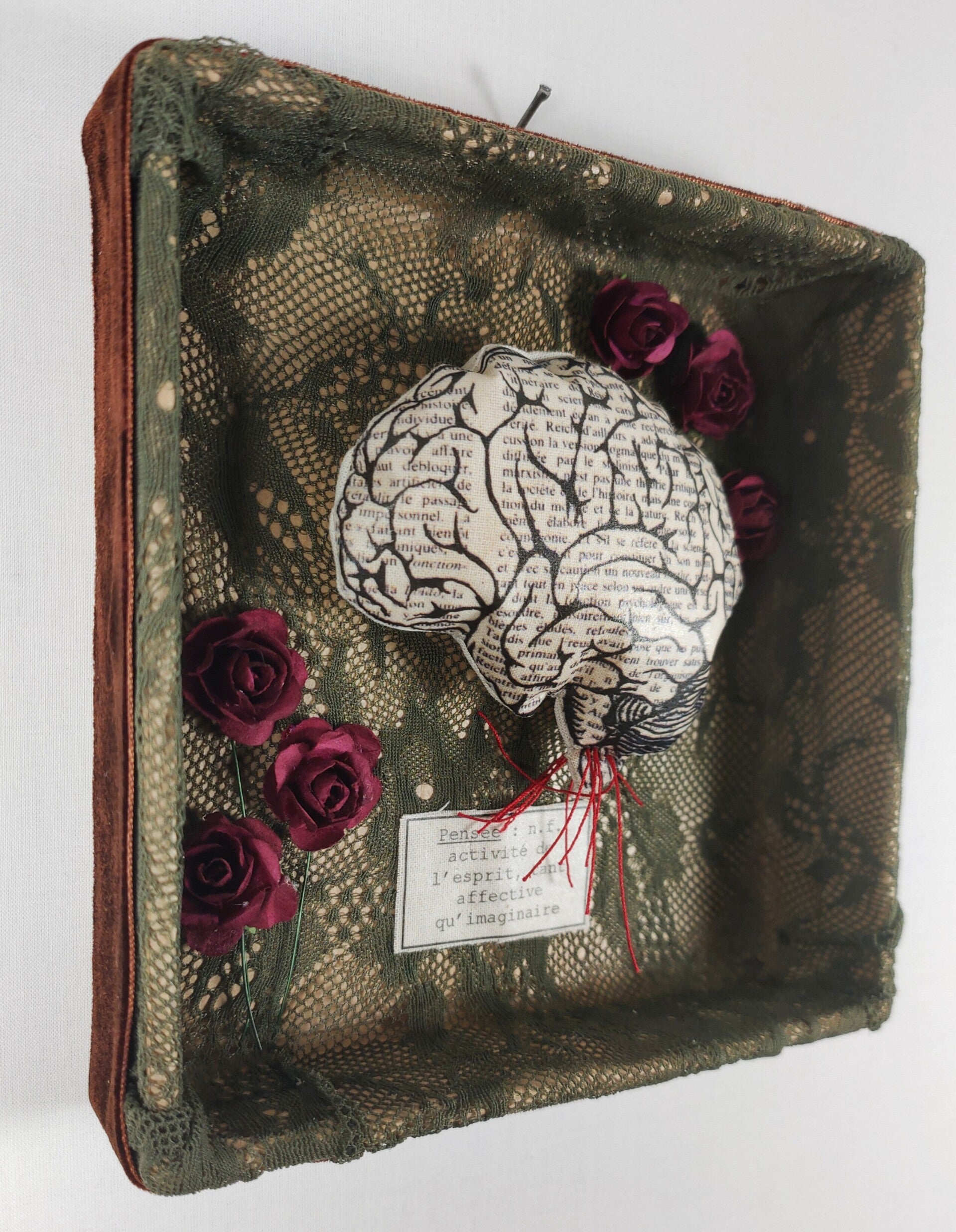 Ecrin boite en carton, fond en dentelle kaki et fleurs tissu prune, bord du cadre ruban de velours rouille.