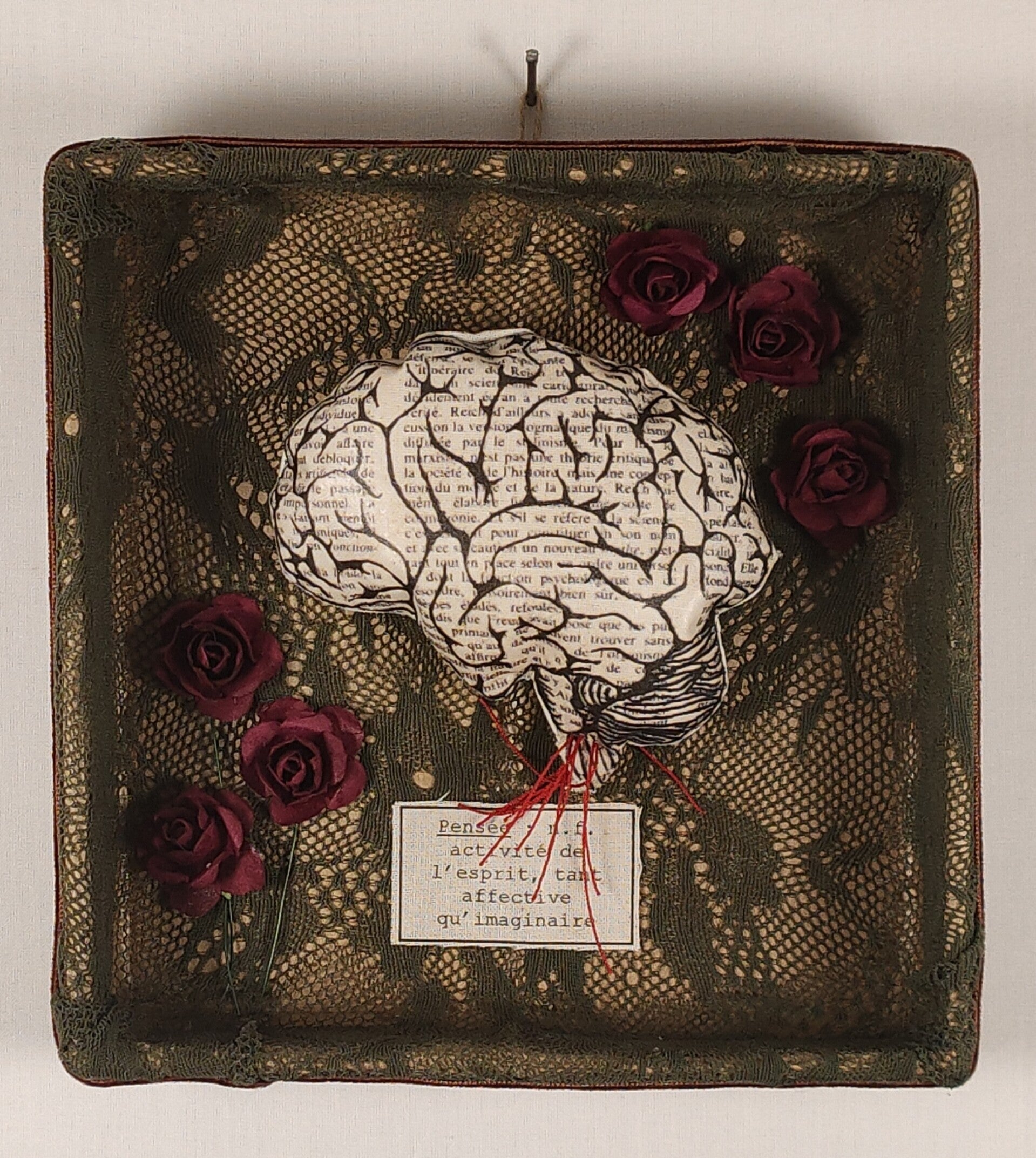 Dessin cerveau Mar Plij, cousu de fils rouge, tranféré sur textile et mis en volume.