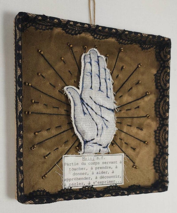 Dessin Main Mar Plij tranféré sur textile et mis en volume.